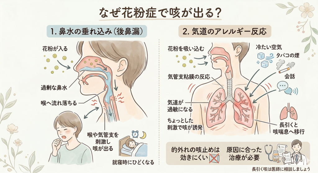 花粉症で咳が出る仕組みは、主に2つあります。