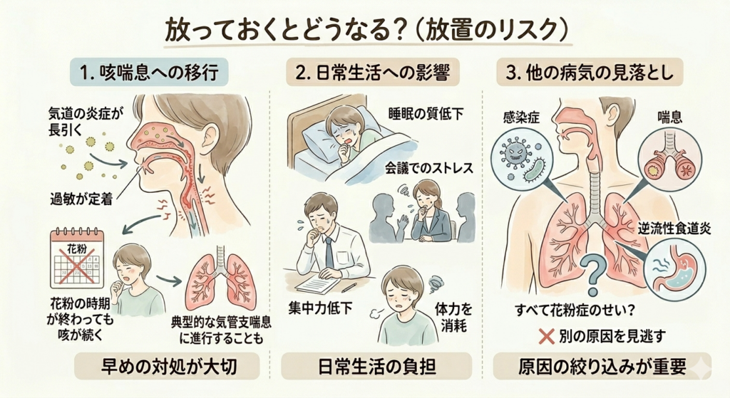 「たかが咳だし、花粉の時期が過ぎれば治まるだろう」と考える方は多いのですが、放置にはいくつかのリスクがあります。