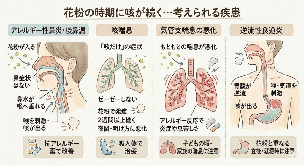 花粉の時期に咳が続く場合、以下のような疾患が考えられます。
